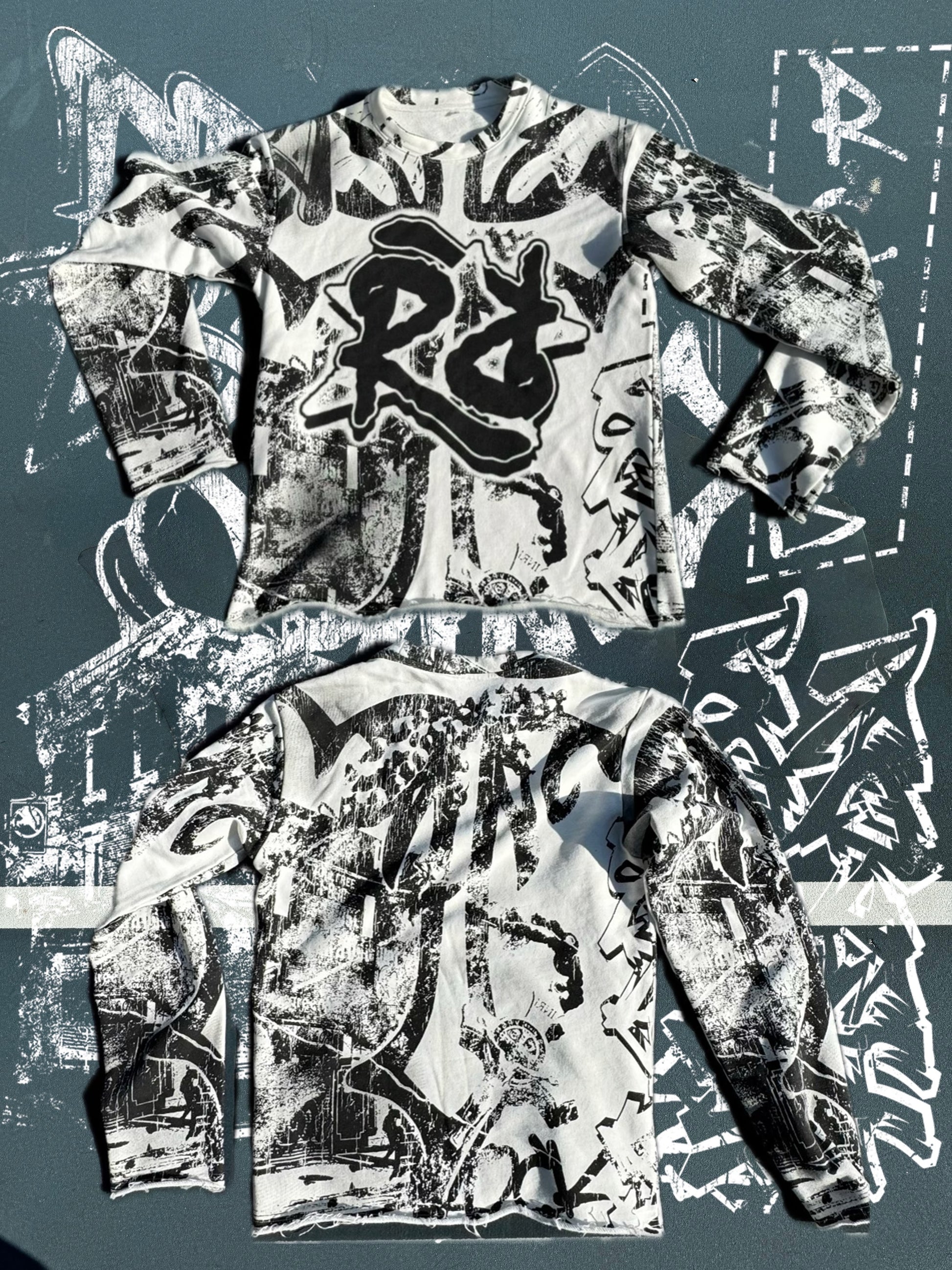 Step into bold street style with this white long sleeve, made from premium fleece cotton for ultimate comfort and warmth. Featuring the iconic RR logo front and center, this piece takes it up a notch with custom graffiti-inspired cross art, giving it that unapologetic, rebellious edge. The raw, unhemmed sleeves and shirt cut add a rugged, unfinished vibe, perfect for those who embrace a modern rockstar aesthetic.